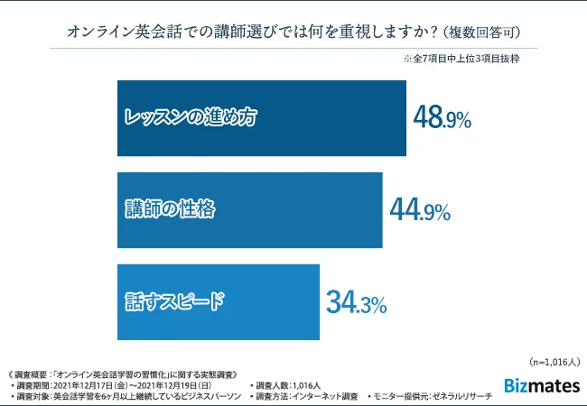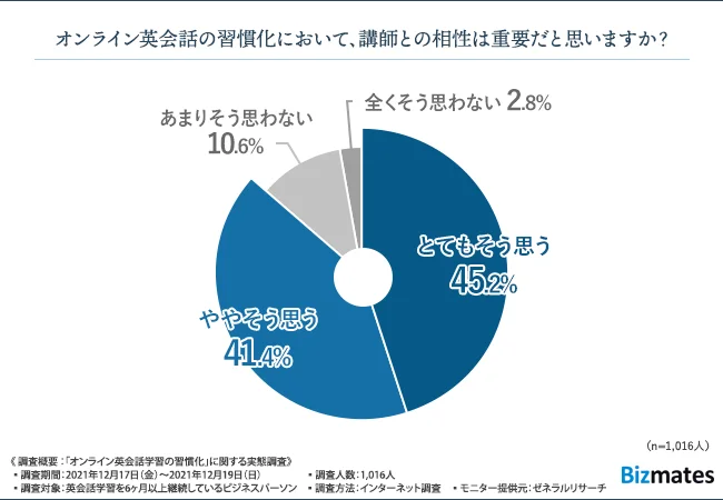 出典:【オンライン英会話学習の習慣化に関する実態調査】オンライン英会話継続の秘訣 約8割が“講師との相性”と回答 ~英会話学習を6ヶ月以上継続しているビジネスパーソン約1000人に調査~