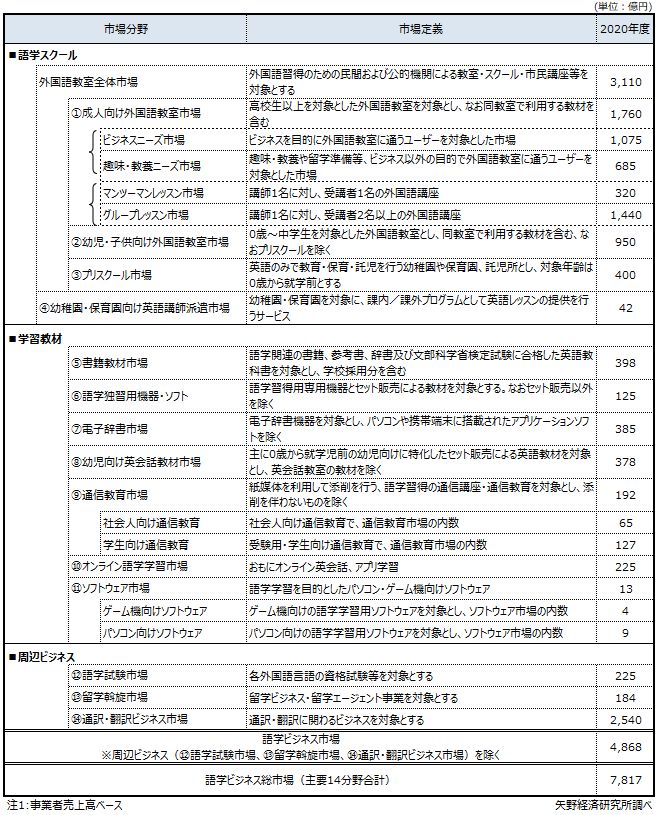 2020年度の語学ビジネス市場は前年度比10.8%減の7,817億円